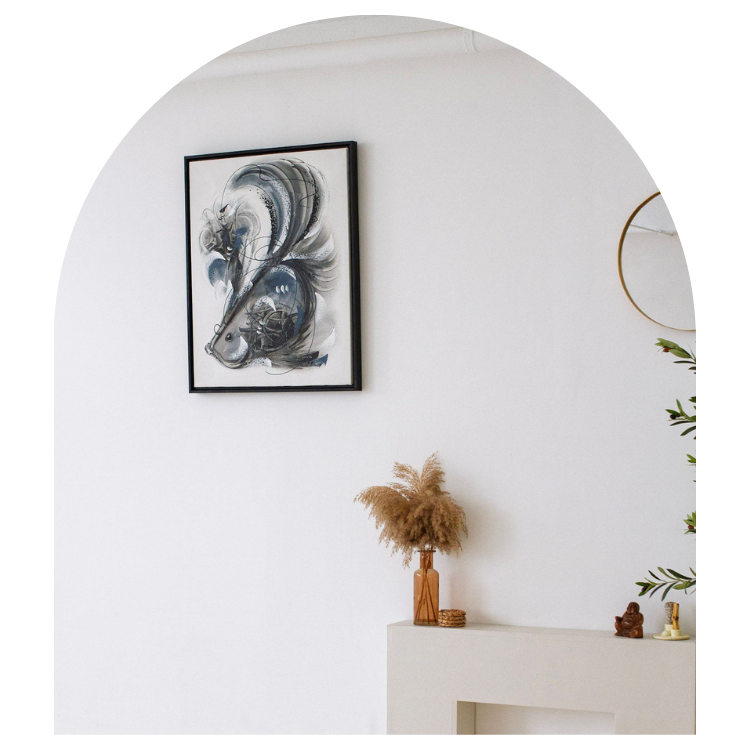 This dynamic and expressive painting captures the fluidity and grace of a fish, rendered in bold, sweeping strokes of monochrome hues. The abstract design combines intricate details with freeform lines, creating a sense of movement and energy that draws the viewer in. The contrast between light and dark tones adds depth and dimension, making this piece a striking focal point in any room.