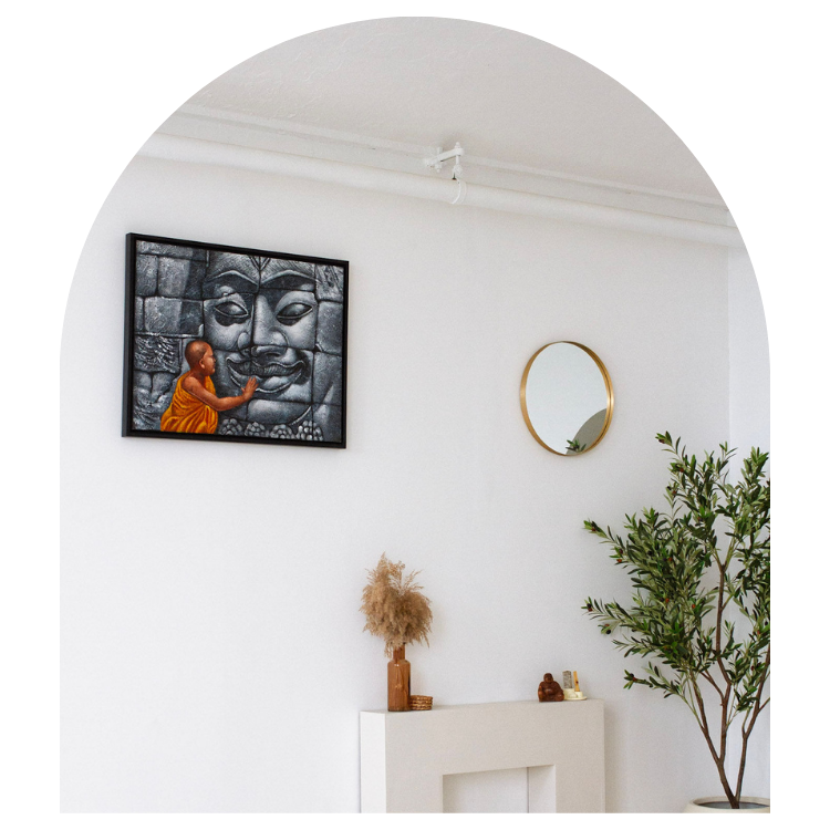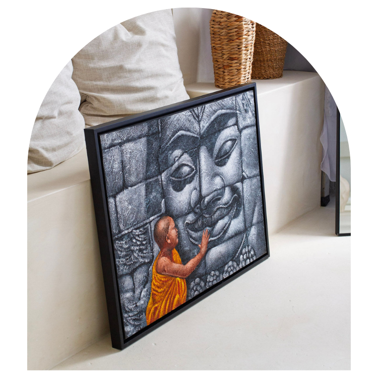 The intricate details of the stone carving and the serene expression on both the monk's face and the stone figure add depth and emotion to the piece. Framed and ready to hang on your wall, this artwork will make a profound statement in any space, symbolising the enduring presence of spirituality and tradition. Perfect for those who appreciate art with deep cultural and spiritual meaning.