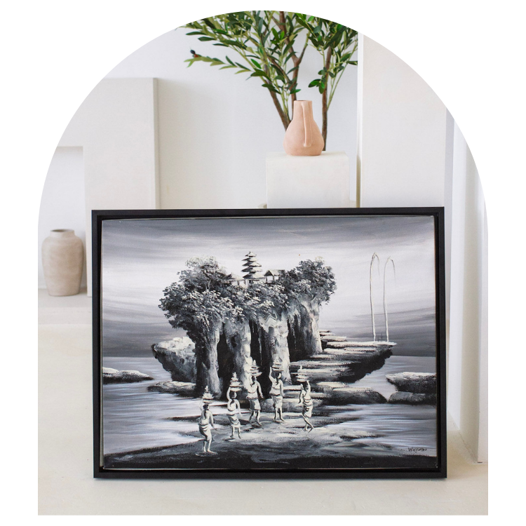 Tanah Lot Temple, a famous Balinese sea temple perched on a rock formation. The artwork captures the dramatic landscape with the temple situated on a cliff, surrounded by lush vegetation and intricate stone steps leading down to the sea. Figures of people are seen ascending and descending the steps, adding a sense of movement and life to the scene. The artist's use of contrast and shading creates a sense of depth and texture, enhancing the overall ethereal and mystical atmosphere of the painting. This piece beautifully conveys the spiritual and natural beauty of Tanah Lot Temple, making it a captivating addition to any art collection.